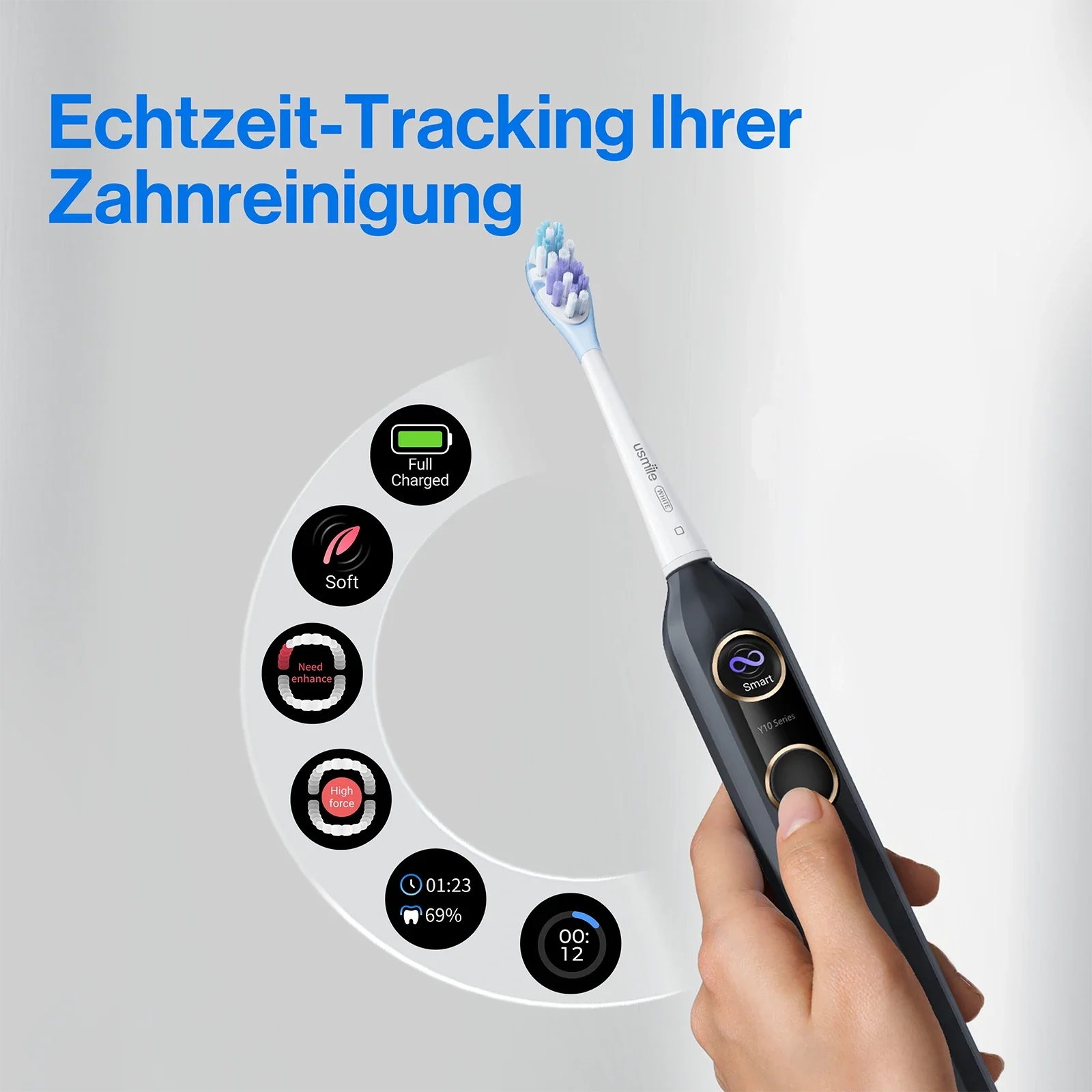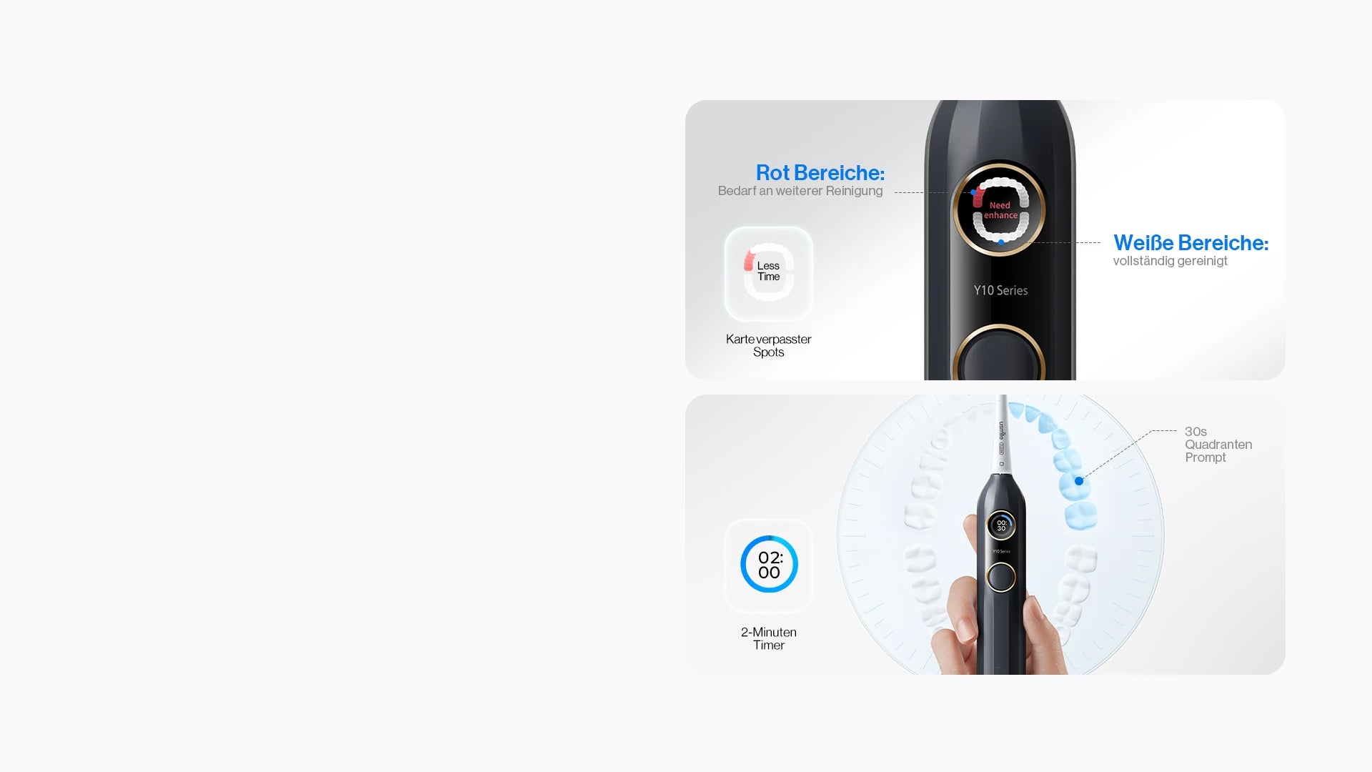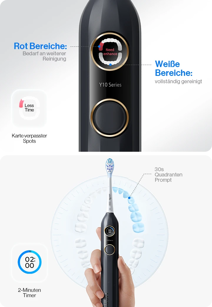 Mit intelligenter Mundkarte und integriertem 2-Minuten-Timer führt die Y10 Sie diskret durch Ihre Routine. Sie signalisiert alle 30 Sekunden den Wechsel des Putzbereichs, sodass Sie gleichmäßig und mit Vertrauen reinigen.