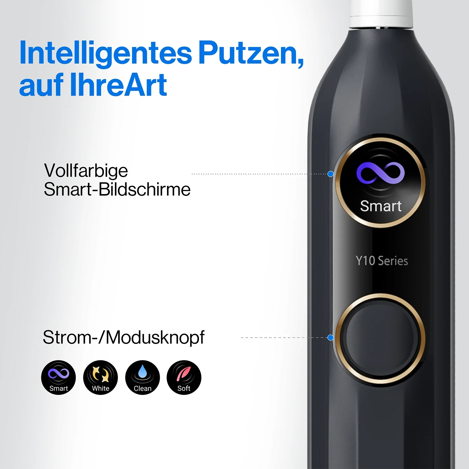 4 Putzmodi, ein personalisiertes Erlebnis. Jeder Modus der Y10 ist gezielt auf unterschiedliche Bedürfnisse abgestimmt und hilft, Verfärbungen zu entfernen, Plaque zu reduzieren und tägliche Ablagerungen sanft zu beseitigen – ohne Unbehagen.
