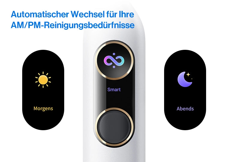 Turbo-Reinigung für Ihren morgendlichen Trubel, Tiefenreinigung für abendliche Verfärbungen. Erleben Sie Rund-um-die-Uhr-Pflege mit unserem intelligenten AM/PM-Modus, der sich automatisch an Ihre tägliche Routine anpasst.