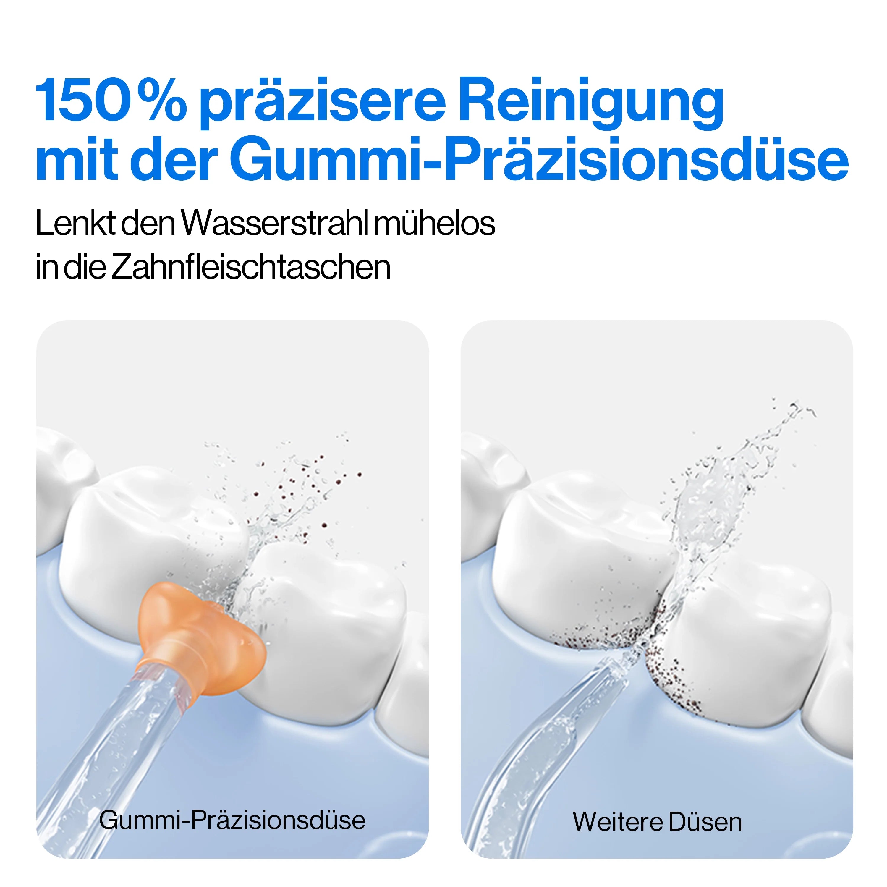 Die C10 leitet den Wasserfluss problemlos in schwer erreichbare Bereiche wie Zahnfleischtaschen und zwischen die Zähne und sorgt so für eine sanfte, gründliche Reinigung, ohne das Zahnfleisch zu schädigen.
