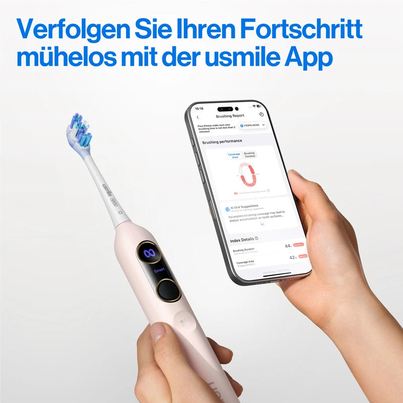 Erleben Sie die nahtlose Synergie zwischen der usmile-App und dem Y20 PRO – Ihre Putzdaten bleiben kontinuierlich synchronisiert und bieten jedes Mal intelligente, personalisierte Anleitungen.